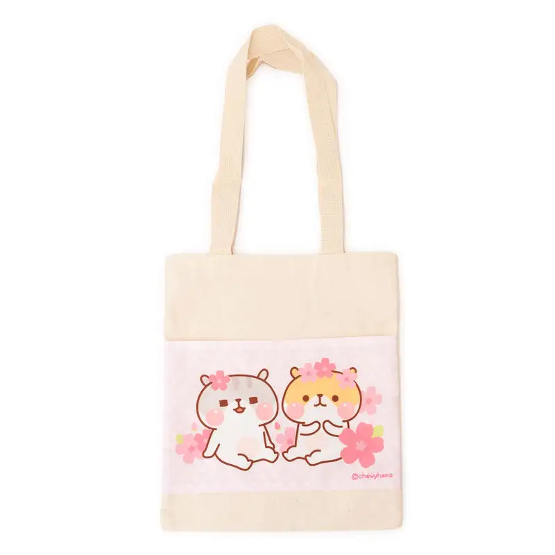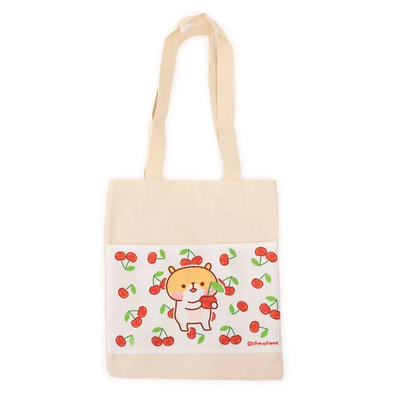 Carry your daily essentials in a super cute Chewyhams Pocket Eco Tote Bag! Made of sturdy canvas with either a Cherries or Flowers printed design on the front.