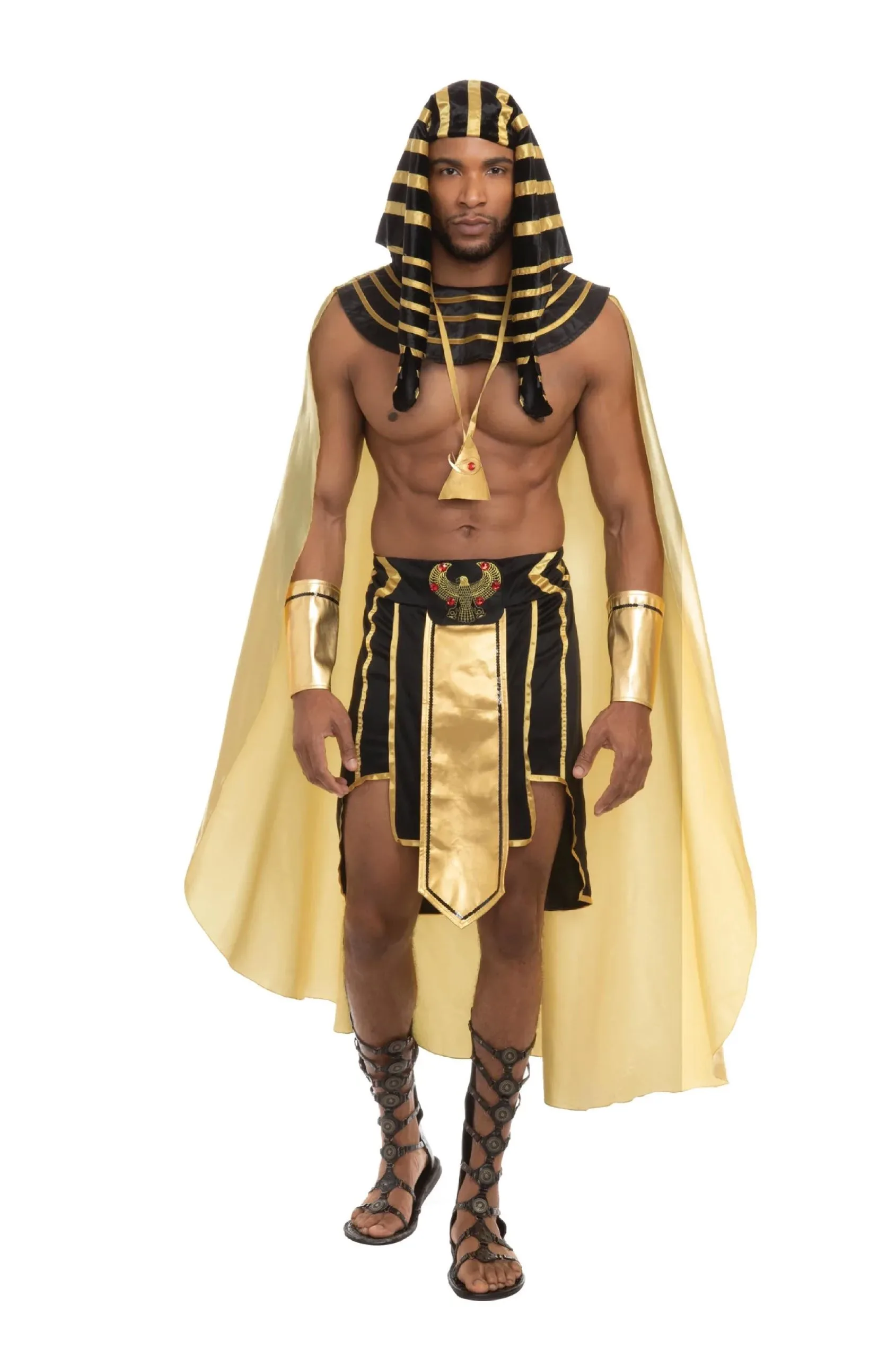 Reign your kingdom as a vision of desire in this versatile men’s costume featuring a detailed Egyptian collar with attached gold cape, sleeveless shirt, wrist gauntlets, Egyptian headpiece, Eye of Horus necklace and Shendyt skirt.
