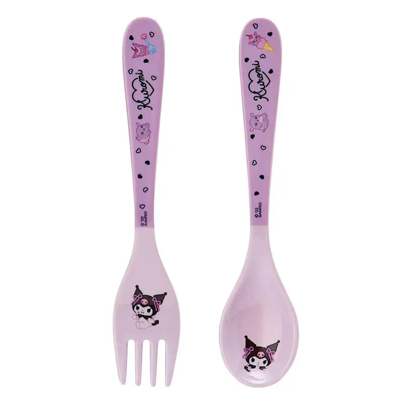 The mischievous Kuromi presents an adorable fork and spoon! Make your dinner extra cute with Sanrio! Made of Melamine, not dishwasher or microwave safe.